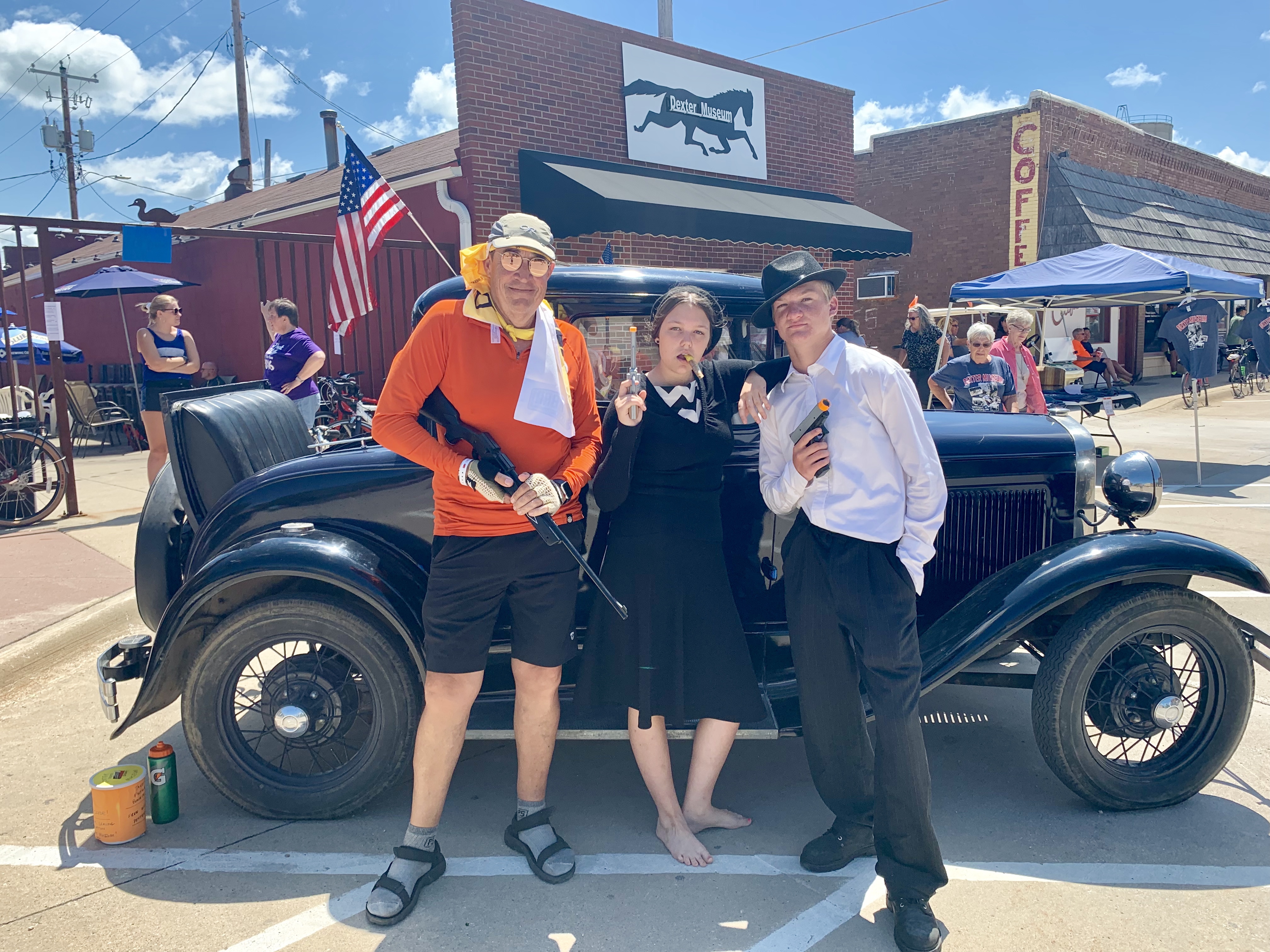 The second day, Atlantic to Winterset, was lovely. The hills were easier, though again, not really bad at all if you’ve trained. The snag today was wind. It seemed just like back home with some strong trades. So yeah, since I’m used to it, not a problem. It was a bit longer than the first day, clocking in at 68 miles. My favorite spot was the small town of Dexter, which has a little museum big on Bonnie and Clyde. They even showed up and I got a picture with them