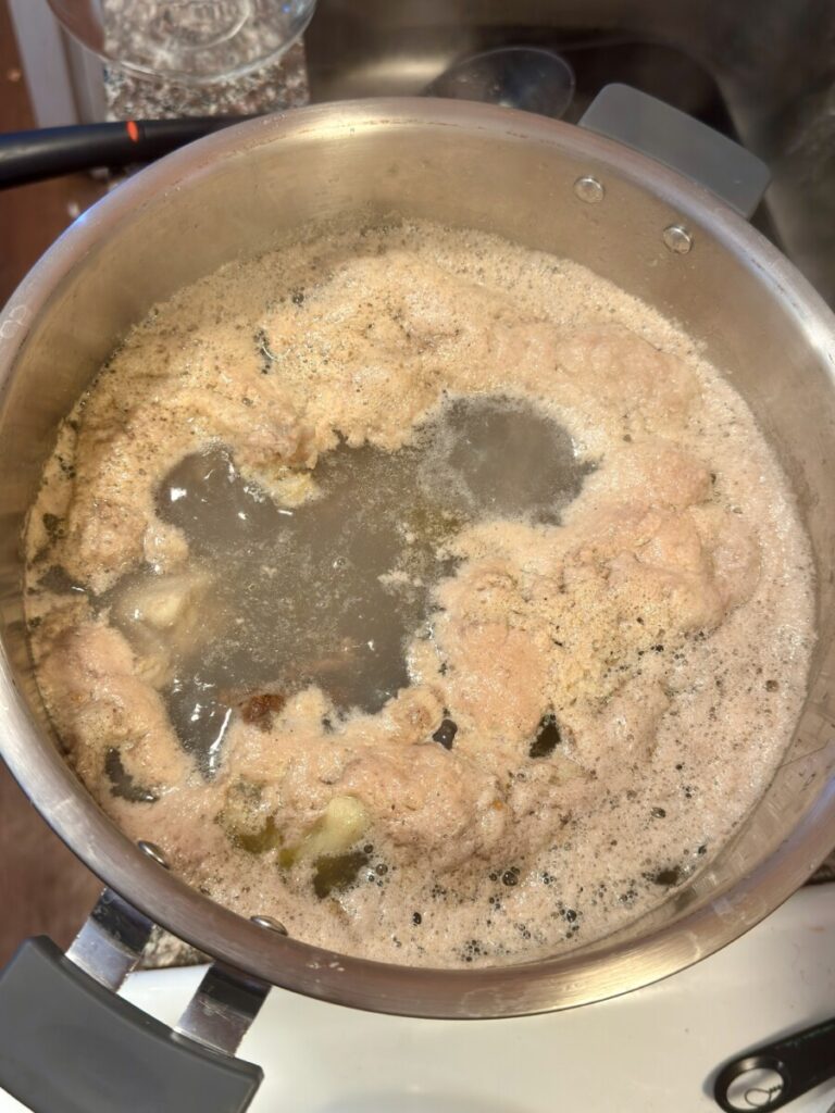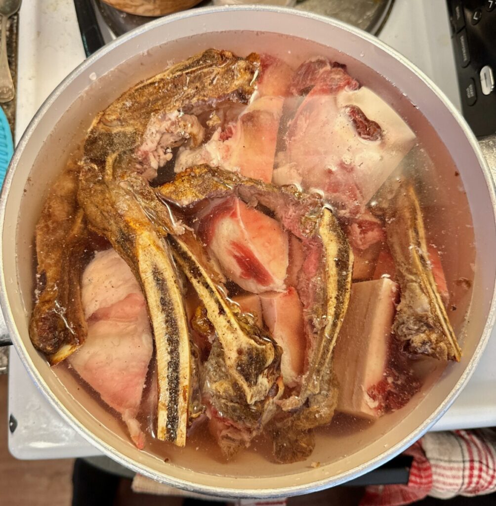 The first image shows the bones I’m using, including those from my recent bone-in NY Strips! I decided to change pots though and that’s shown in the second image. That pot is actually the inside of Instant Pot (eight quart model). The third image shows the mess that rises when blanching the bones for a couple of minutes.
