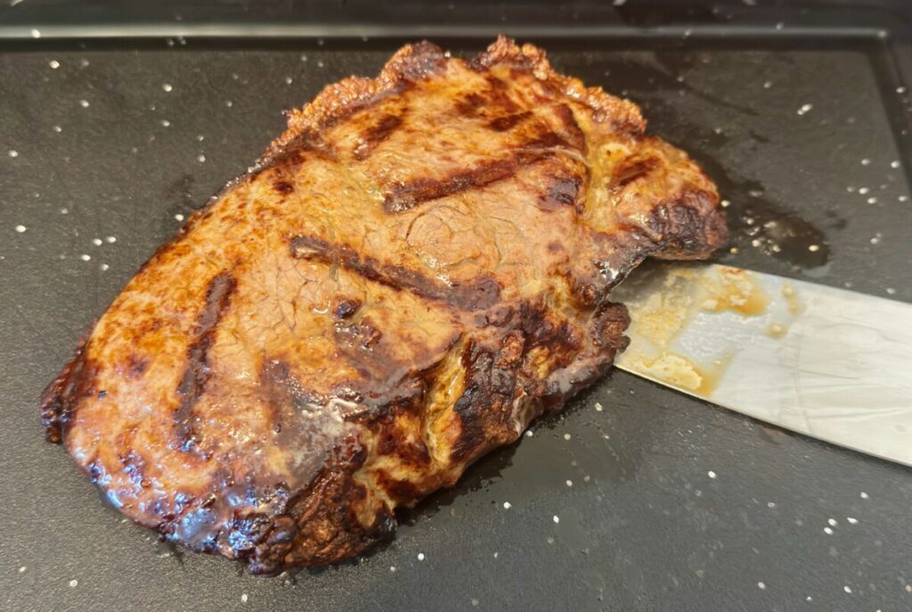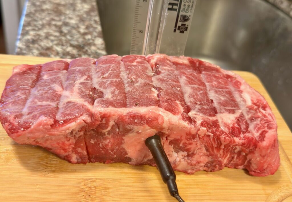Here’s the one I cooked just prior to cooking. I’ve coated it lightly in beef tallow and inserted my Ninja’s temperature probe. I put a ruler up next to the steak to show that this one is about an inch and a quarter thick. That’s pretty darn good for them.