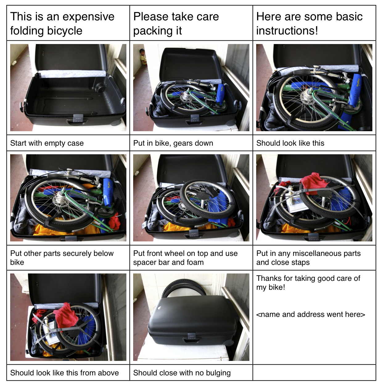 I can never find this when I want it, though I do keep copies around…sigh. Basically it’s simple instructions on how to pack my Bike Friday. I generally keep a copy inside my suitcase just in case TSA decides to completely unpack my bike. They haven’t yet, though I have found their calling cards.